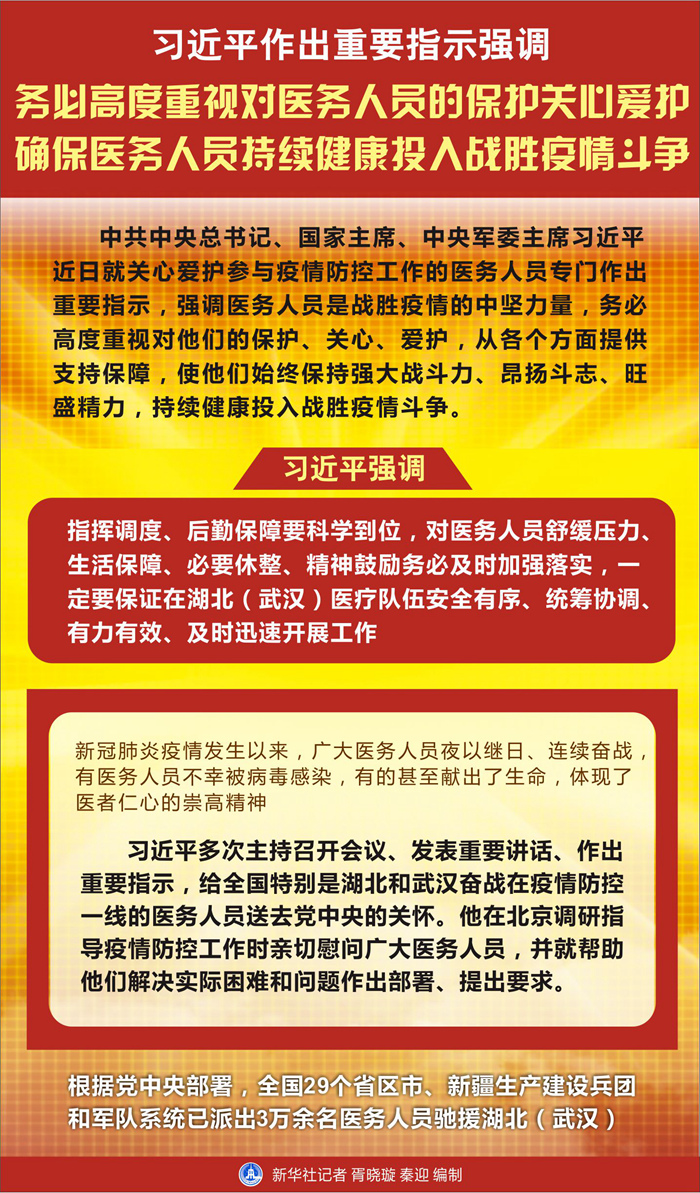 习近平强调,指挥调度、后勤保障要科学到位,对医务人员舒缓压力、生活保障、必要休整、精神鼓励务必及时加强落实,一定要保证在湖北(武汉)医疗队伍安全有序、统筹协调、有力有效、及时迅速开展工作。