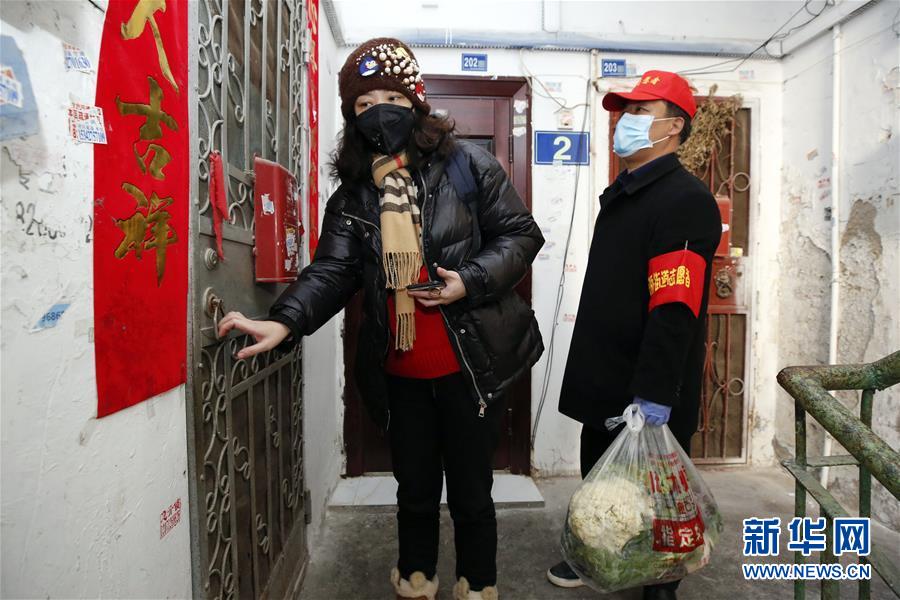 湖北省武汉市江岸区花桥社区志愿者蒋晨一(左)和下沉社区的干部谢文先来到一名独居老人家为其送菜(220日摄)。  新华社记者 沈伯韩 摄