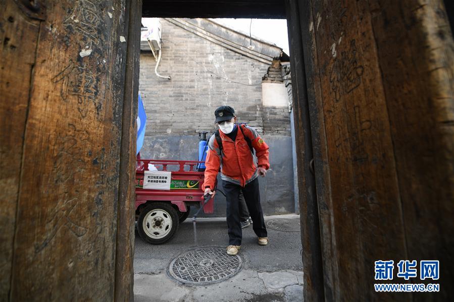 北京市东城区前门街道大江社区志愿者孟连友在青云胡同一处平房院落喷洒消毒液。孟连友从除夕开始,一直在社区做志愿者,负责胡同里的消毒工作(310日摄)。  新华社记者 鞠焕宗 摄