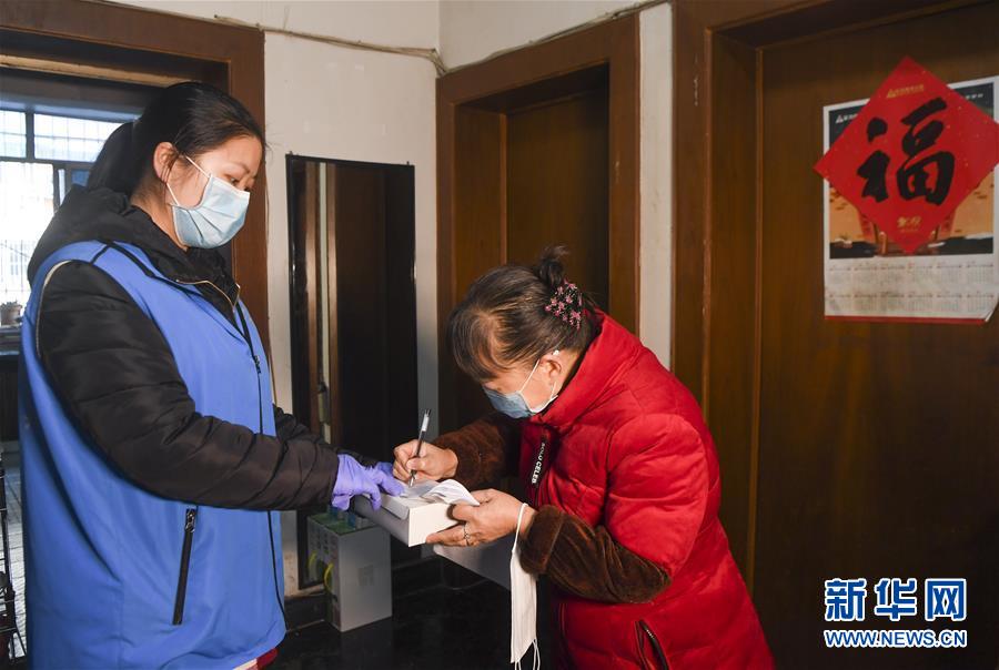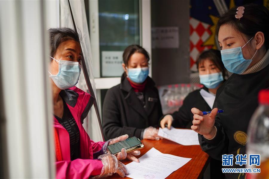 219日,重庆市渝北区龙塔街道工农社区工作人员(左)向居民发放口罩。 新华社记者 王全超 摄