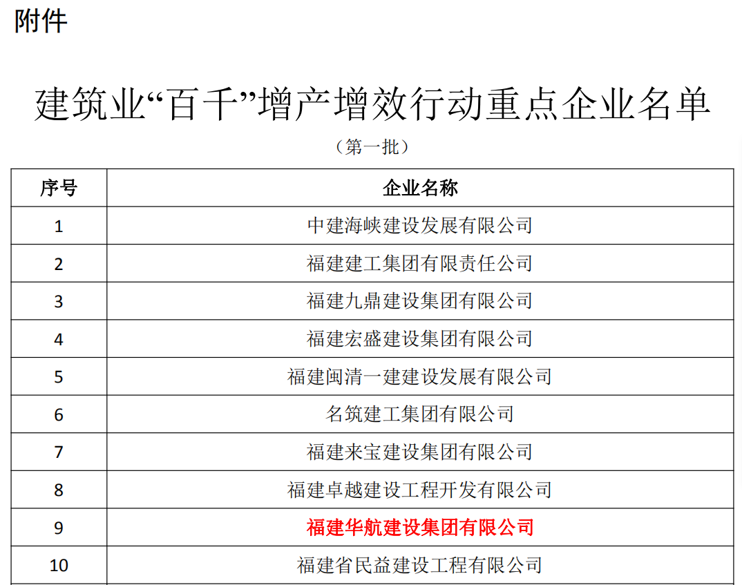 根据《实施一二三产业“百千”增产增效行动方案》指示要求,福建省住房和城乡建设厅印发《福建省建筑业“百千”增产增效行动实施方案》并公布第一批建筑业企业名单(100家),华航集团成功入选。