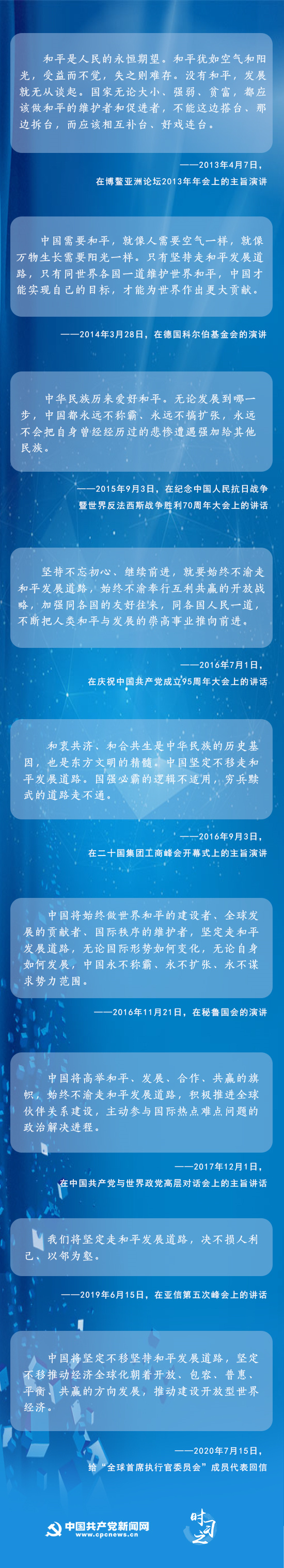 和平与发展是当今时代的主题,也是时代的命题。当今世界正经历百年未有之大变局,但和平、发展、合作、共赢的时代潮流没有变。面对纷繁复杂的世界形势,中国如何走好“和平发展道路”?对于时代命题,习近平给出答案。
