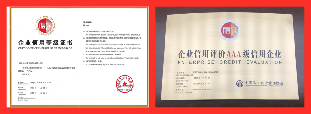 工程建设企业社会信用评价工作,是中国施工企业管理协会为贯彻落实国家信用体系建设要求,规范推进工程建设行业信用体系发展而开展实施的。获评AAA级信用企业,表明企业经营状况突出,在经营管理、项目管理、质量安全管理、财务管理、人力资源管理、经济效益、社会责任等方面与市场发展需要接轨,社会信用记录优秀。该项国家级AAA信用评级的获得,展现了华航集团在企业经营拓展、诚信建设、履约能力、社会信誉等方面取得的成绩,将对企业在市场开拓、评先评优等方面起到重要作用。华航集团将以此为新的起点,进一步创新发展、开拓进取,将诚信融入到文化建设、经营管理、人才培养等方面,实现快速稳健发展。