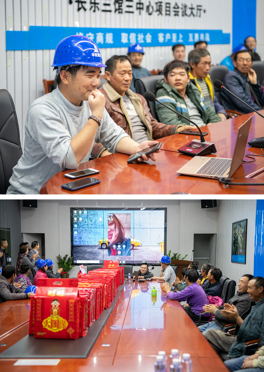 “传递亲情云相聚”现场,工人代表们通过大屏幕与家人连线。他们之中有为了响应政府号召留在当地过年的年轻恋人,本应回家结婚的他们只能推迟婚期;一位外公在外孙女的声声呼唤中,心情激动得都顾不得与女儿说话了;还有儿子正在服役,因为部队纪律不便连线的父亲,听着他思念亲人又顾全大局的话语,大家肃然起敬并报以热烈的掌声。这跨越空间的连接,让许多两地的心连在了一起,也让建设者们把就地过年的温暖和欢乐告诉了家人,让家人们安心又暖心。