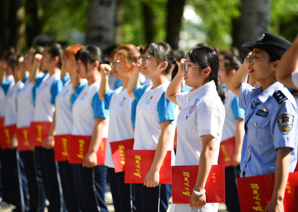在河北,新党员代表在西柏坡纪念馆广场进行入党宣誓活动。新华社记者王晓摄