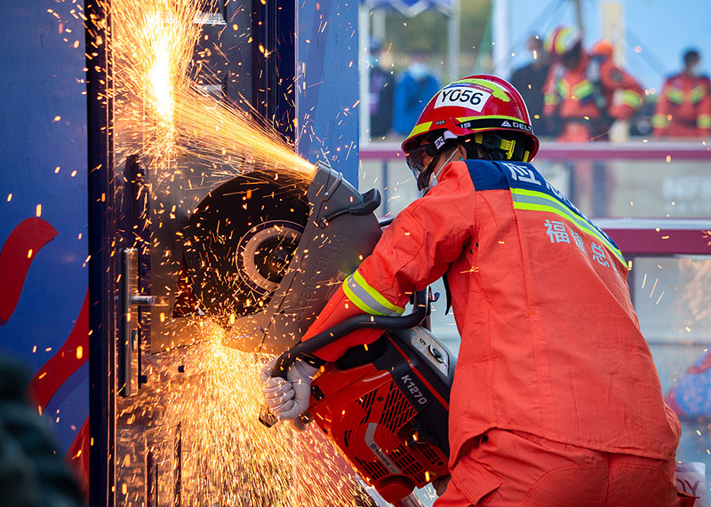 2021年10月28日,参加首届全国消防行业职业技能大赛决赛的消防队员在比赛中。