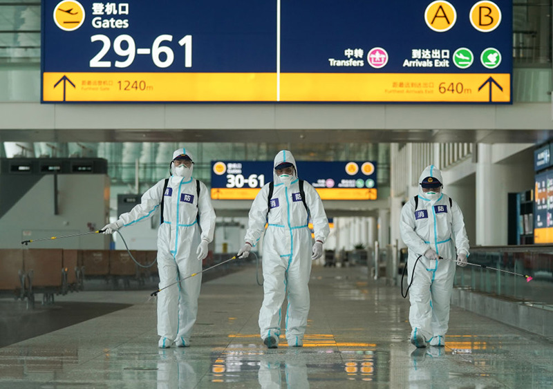 2020年4月3日,消防队员在航站楼进行消杀作业。