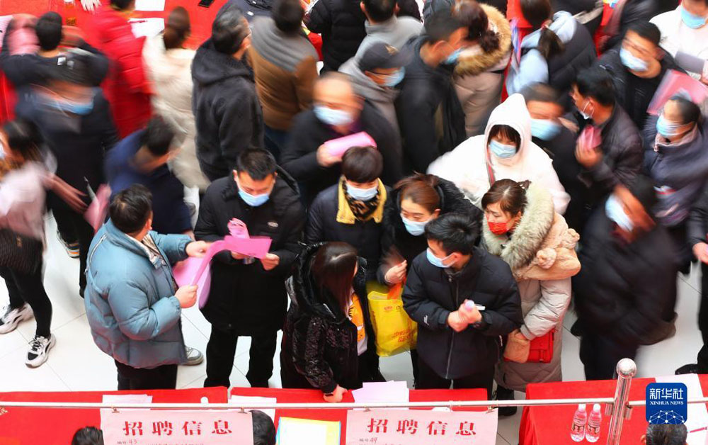 求职人员在山东省滕州市“春风送岗”春季人才招聘会上寻找就业岗位(2022219日摄)。 新华社发(李志军 摄)