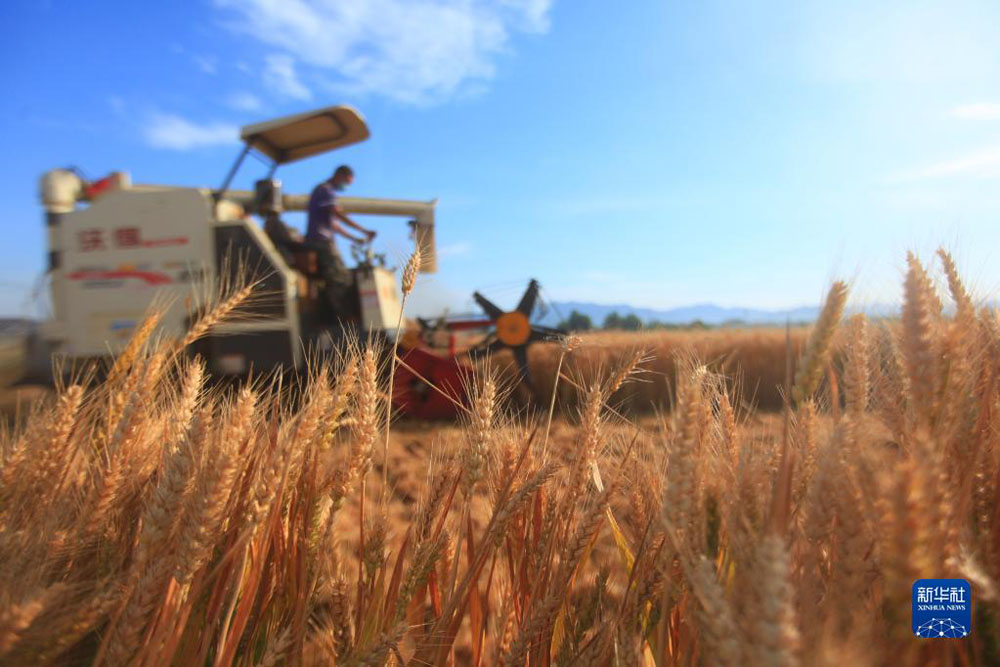 山东省临沂市平邑县农民驾驶收割机在田间收获小麦(202168日摄)。 新华社发(武纪全摄)