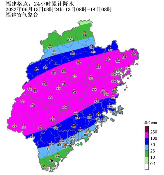 据统计,6508时~1306时累计83个县的1059个乡镇超过100毫米,其中54个县的277个乡镇超过250毫米,5个县的23个乡镇超过400毫米,以武平桃溪镇489.9毫米为最大。最大小时雨量为仙游游洋镇78.6毫米。