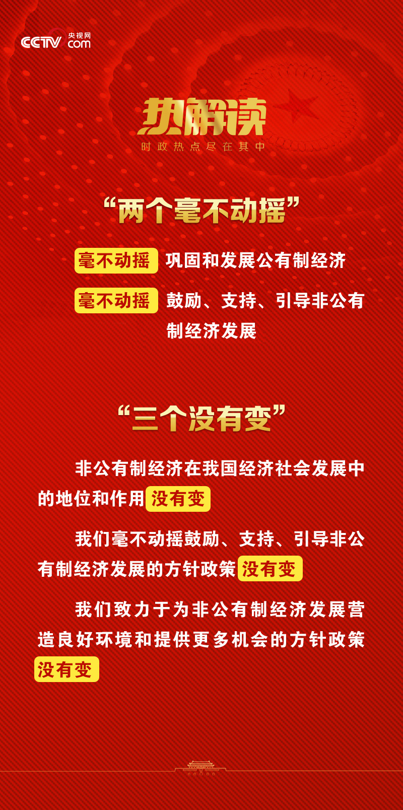 2016年全国两会期间,习近平总书记就曾参加以经济界人士为主的民建、工商联界委员联组会,就坚持我国基本经济制度问题发表讲话,并特别用“两个毫不动摇”和“三个没有变”来提振民营经济信心。
